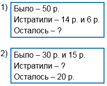 У Юры было 50 р. Он купил тетрадь за 6 р. и краски за 14 р. Сколько рублей осталось у Юры?