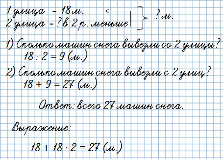 1. С одной улицы вывезли 18 грузовых машин снега, а с другой — в 2 раза меньше. Сколько всего машин снега вывезли с двух улиц?