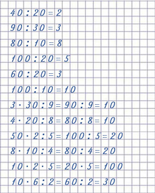 | 3 • 30 : 9 = 10 1) 3 • 30 = 90 2) 90 : 9 = 10 4 • 20 : 8 = 10 1) 4 • 20 = 80 2) 80 : 8 = 10 50 • 2 : 5 = 20 1) 50 • 2 = 100 2) 100 : 5 = 20 | 8 • 10 : 4 = 20 1) 8 • 10 = 80 2) 80 : 4 = 20 10 • 2 • 5 = 100 1) 10 • 2 = 20 2) 20 • 5 = 100 10 • 6 : 2 = 1) 10 • 6 = 60 2) 60 : 2 = 30 |