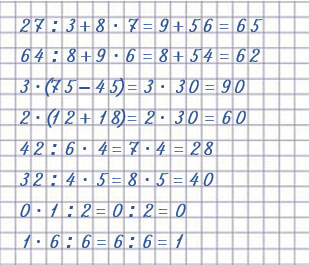 | 27 : 3 + 8 • 7 = 65 1) 27 : 3 = 9 2) 8 • 7 = 56 3) 9 + 56 = 65 | 42 : 6 • 4 = 28 1) 42 : 6 = 7 2) 7 • 4 = 28 |