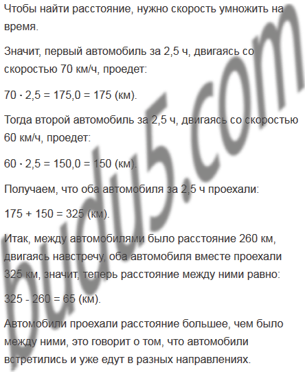 Из двух пунктов, расстояние между которыми равно 260 км, навстречу друг другу одновременно выехали два автомобиля. Скорость одного автомобиля равна 70 км/ч, а скорость второго - 60 км/ч. Какое расстояние будет между автомобилями через 2,5 ч после начала движения?