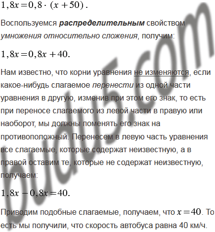Автобус проходит расстояние от города до села за 1,8 ч, а легковая автомашина - за 0,8 ч. Найдите скорость автобуса, если известно, что она меньше скорости легковой автомашины на 50 км/ч.