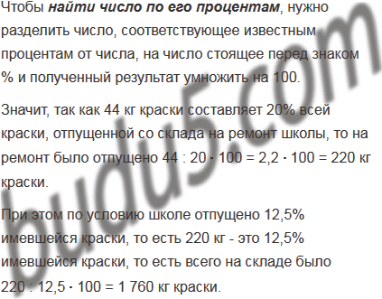 На ремонт физкультурного зала было израсходовано 44 кг краски, что составляет 20% всей краски, отпущенной со склада на ремонт школы. Сколько килограммов краски было на складе, если школе отпущено 12,5% имевшейся краски?
