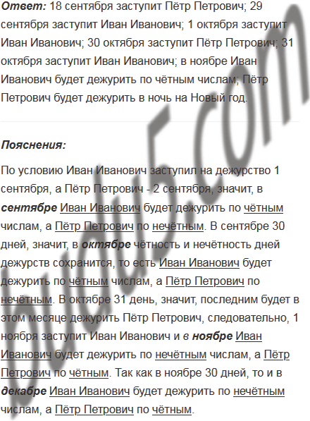В школе работают два ночных охранника - Иван Иванович и Пётр Петрович. Они дежурят по очереди с вечера до утра следующего дня. Иван Иванович заступил на дежурство 1 сентября, а Пётр Петрович - 2 сентября. Кто из них заступит на дежурство 18 сентября? 29 сентября? 1 октября? 30 октября? 31 октября? По каким числам - чётным или нечётным - будет дежурить Иван Иванович в ноябре? Кто из них будет дежурить в ночь на Новый год?