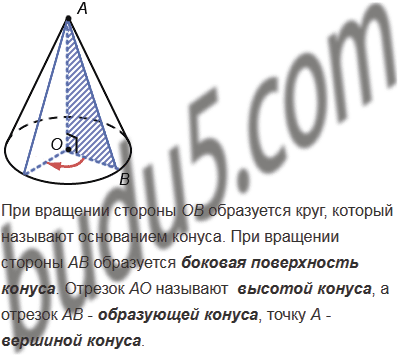 На рисунке 67 изображён конус. Укажите: 1) вершину конуса; 2) центр его основания; 3) образующую конуса; 4) радиус основания конуса; 5) высоту конуса.
