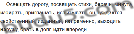 Осв..щать дорогу, посв..щать стихи, б..речь, м..нута, изб..рать, пр..глашать, испыт..вать, он нужда..тся, свойстве(н, нн)ый, изда(н, нн)ый, (не)пр..менно, вых..дить (на)ружу, брать (в)долг, и..ти (в)переди.