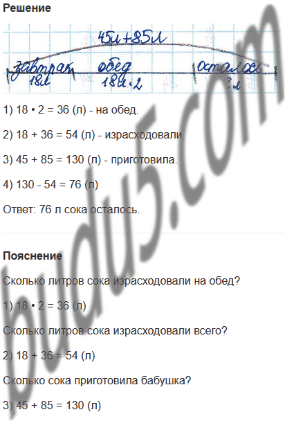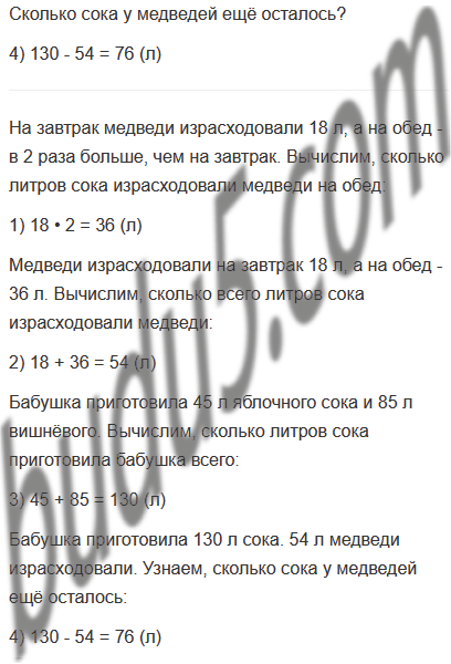 Задание № 11. Бабушка Гамми приготовила 45 л яблочного сока и 85 л вишнёвого. Из них на завтрак медведи израсходовали 18 л, а на обед - в 2 раза больше, чем на завтрак. Сколько сока у медведей ещё осталось?