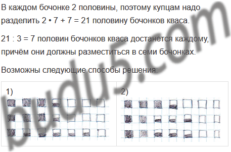 Задание № 16. Три купца хотят поделить между собой 21 бочонок кваса, из которых 7 полных, 7 наполовину полных и 7 пустых. Как им это сделать, не переливая квас, чтобы у каждого оказалось одинаковое количество кваса и бочонков (вместимость всех бочонков одинаковая)?