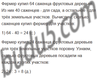 Задание № 64. Фермер купил 64 саженца фруктовых деревьев. Из них 40 саженцев - для сада, а остальные - для трёх земельных участков поровну. Сколько фруктовых деревьев посадили на каждом из этих участков?