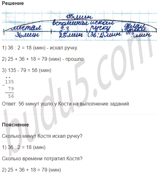 Задание № 7. Костя дома делал уроки 135 минут. Из них 25 минут он вспоминал, что задали, и 36 минут мечтал о мороженом. Затем он искал ручку половину того времени, что мечтал, а остальное время делал задания. Сколько времени ушло у Кости на выполнение заданий?