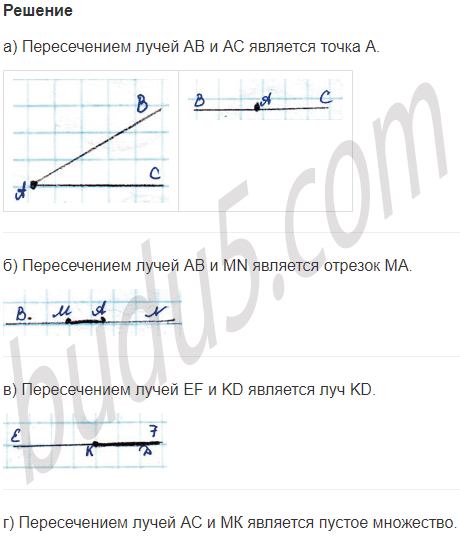 Задание № 12. Начерти два луча, пересечением которых являются: а) точка; б) отрезок; в) луч; г) пустое множество.