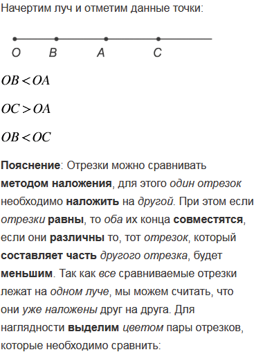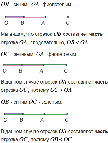 На луче с началом O отмечены точки A, B и C так, что точка B лежит между точками O и A, а точка A - между точками O и C. Сравните отрезки OB и OA, OC и OA, OB и OC.