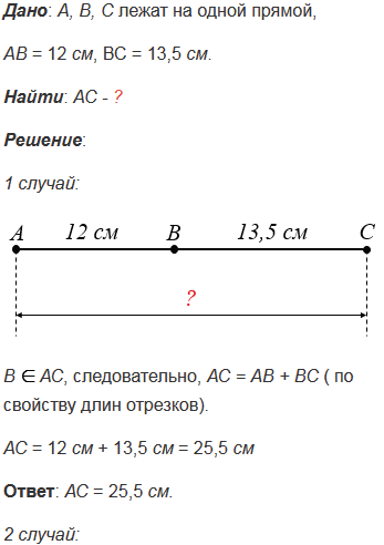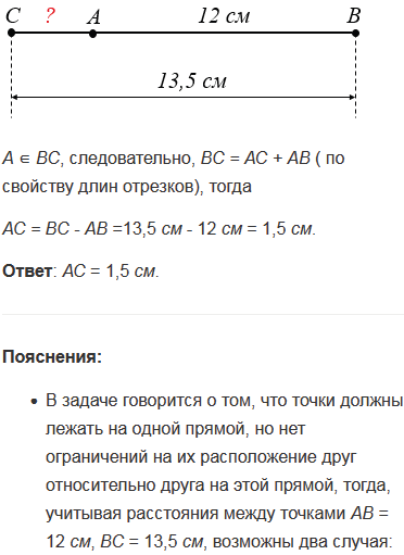 Точки А, В и С лежат на одной прямой. Известно, что АВ = 12 см, ВС = 13,5 см. Какой может быть длина отрезка АС?