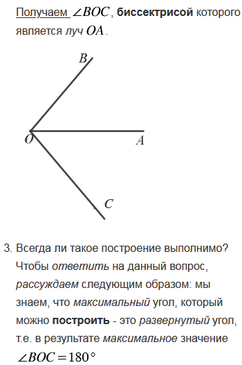 Начертите угол AOB и с помощью транспортира проведите луч OC так, чтобы луч OA являлся биссектрисой угла BOC. Всегда ли это выполнимо?