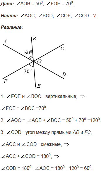 FOE = 700. Найдите углы АОС, BOD, COE и угол между прямыми АD и FC.