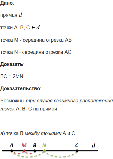 Точки А, В и С лежат на одной прямой, точки М и N — середины отрезков АВ и АС. Докажите, что ВС = 2MN.