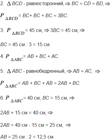 Периметр равнобедренного треугольника АВС с основанием ВС равен 40 см, а периметр равностороннего треугольника ВСD равен 45 см. Найдите стороны АВ и ВС.
