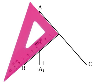 АВС из вершины А к стороне ВС, берем чертежный угольник, прикладываем его так, что одна из его сторон, образующих прямой угол угольника, располагалась вдоль стороны ВС. Вторую сторону угольника, образующую прямой угол, располагаем так, что вершина А лежит вдоль этой стороны.