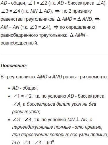 Прямая, перпендикулярная к биссектрисе угла A, пересекает стороны угла в точках M и N. Докажите, что треугольник AMN - равнобедренный.