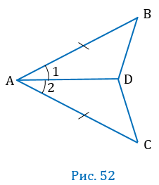 На рисунке 52 (с. 31) AB = AC, BD = DC и BAC = 500. Найдите CAD.