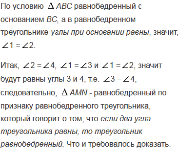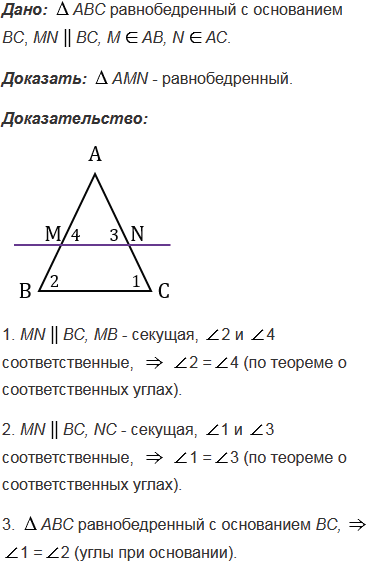 Прямая, параллельная основанию равнобедренного треугольника АВС, пересекает боковые стороны АВ и АС в точках М и N. Докажите, что треугольник АМN равнобедренный.