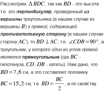 Высота, проведенная к основанию равнобедренного треугольника, равна 7,6 см, а боковая сторона треугольника равна 15,2 см. Найдите углы этого треугольника.