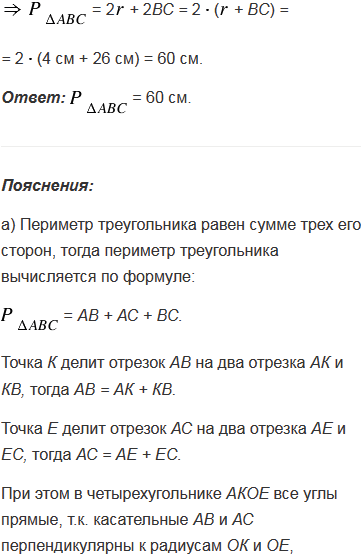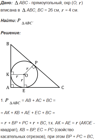 Найдите периметр прямоугольного треугольника, гипотенуза которого равна 26 см, а радиус вписанной окружности — 4 см.