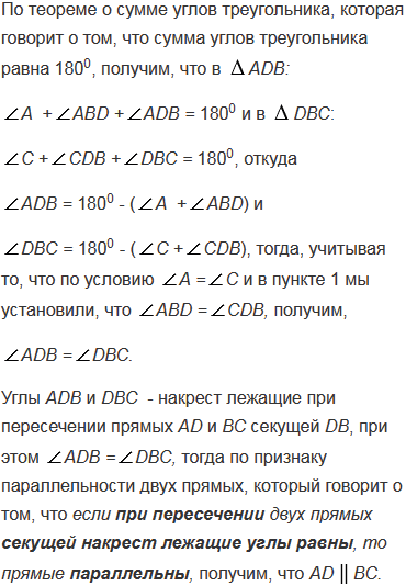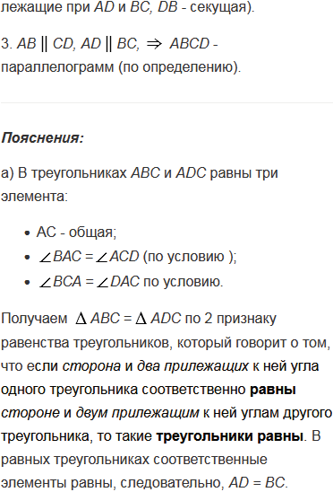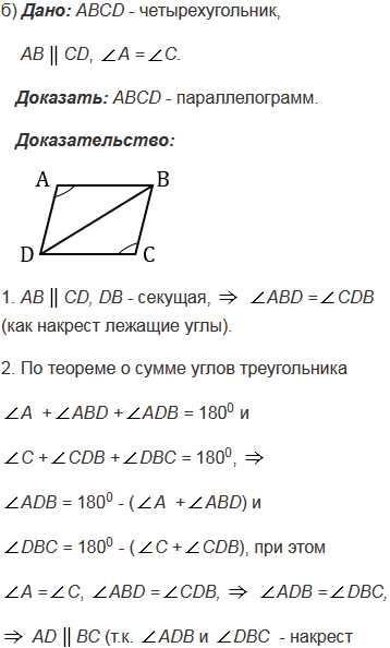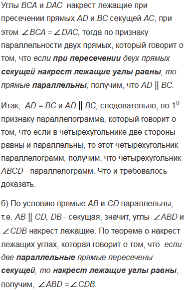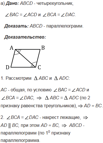 Докажите, что выпуклый четырехугольник АВСD является параллелограммом, если: а) ВАС =АСD и ВСА =DАС; б) АВСD, А =С.