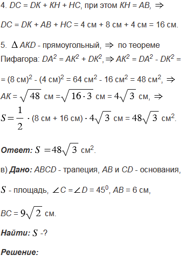 Найдите площадь трапеции АВСD с основаниями АВ и СD, если: а) АВ = 10 см, ВС = DА = 13 см, СD = 20 см; б)