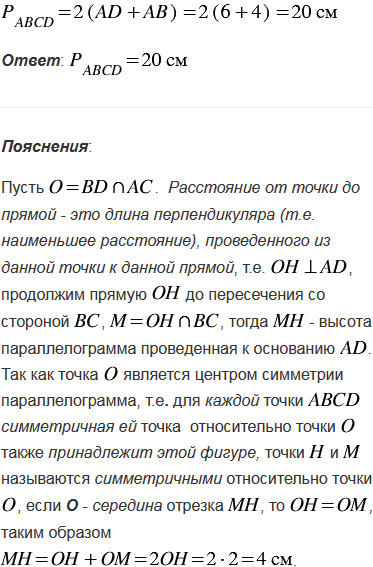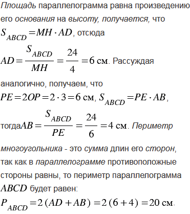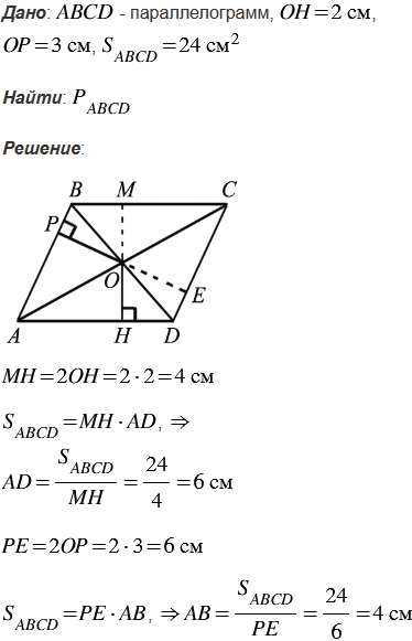 Найдите периметр параллелограмма, если его площадь равна 24 см2, а точка пересечения диагоналей удалена от сторон на 2 см и 3 см.