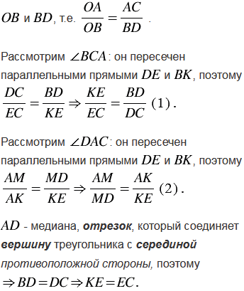 Через точку М, взятую на медиане AD треугольника АВС, и вершину В проведена прямая, пересекающая сторону АС в точке К. Найдите отношение