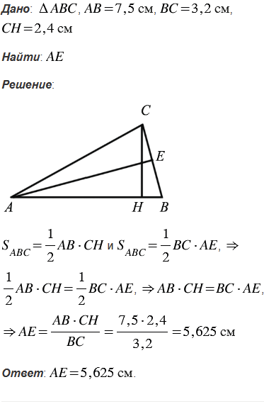 Две стороны треугольника равны 7,5 см и 3,2 см. Высота, проведённая к большей стороне, равна 2,4 см. Найдите высоту, проведённую к меньшей из данных сторон.