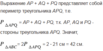Точки Р и Q - середины сторон АВ и АС треугольника АВС. Найдите периметр треугольника АВС, если периметр треугольника АРQ равен 21 см.