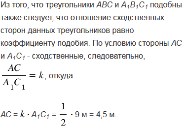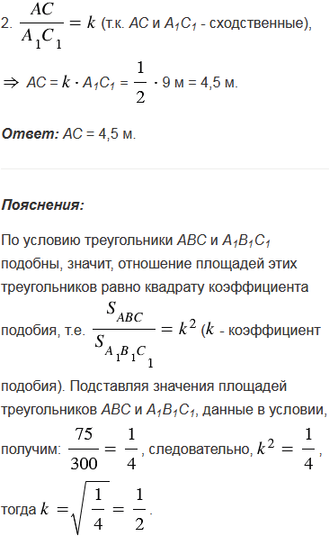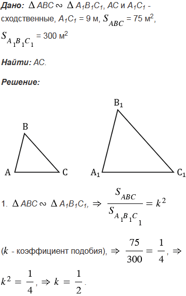 Площади двух подобных треугольников равны 75 м2 и 300 м2. Одна из сторон второго треугольника равна 9 м. Найдите сходственную ей сторону первого треугольника.