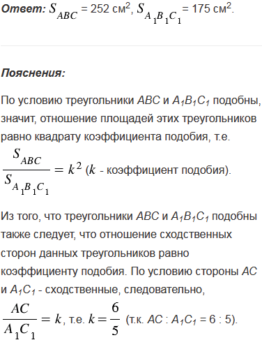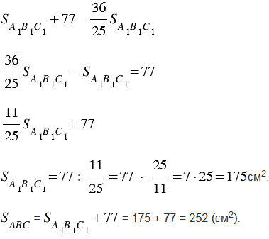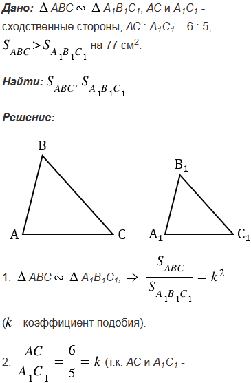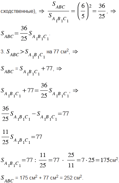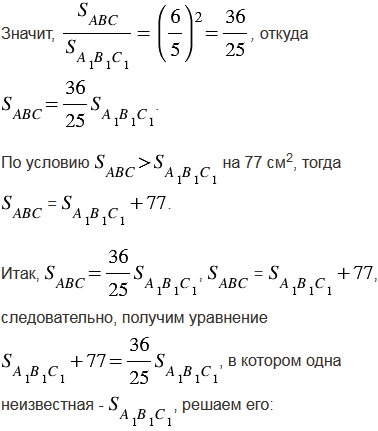 Треугольник АВС и А1В1С1 подобны, и их сходственные стороны относятся как 6 : 5. Площадь треугольника АВС больше площади треугольника А1В1С1 на 77 см2. Найдите площади треугольников.