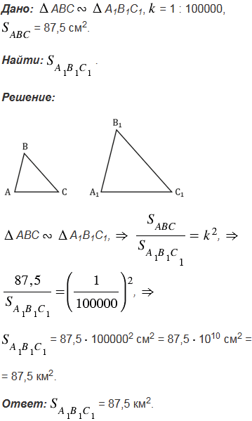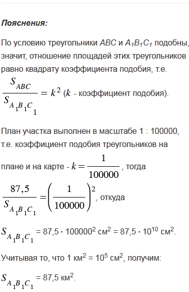 План земельного участка имеет форму треугольника. Площадь изображенного на плане участка равна 87,5 см2. Найдите площадь земельного участка, если план выполнен в масштабе 1 : 100000.