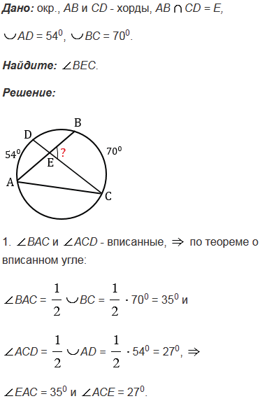 Хорды АВ и СD окружности пересекаются в точке Е. Найдите угол ВЕС, если