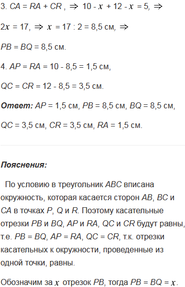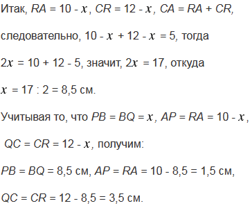 В треугольник АВС вписана окружность, которая касается сторон АВ, ВС и СА в точках Р, Q и R. Найдите АР, РВ, ВQ, QC, СR, RА, если АВ= 10 см, ВС = 12 см, СА = 5 см.