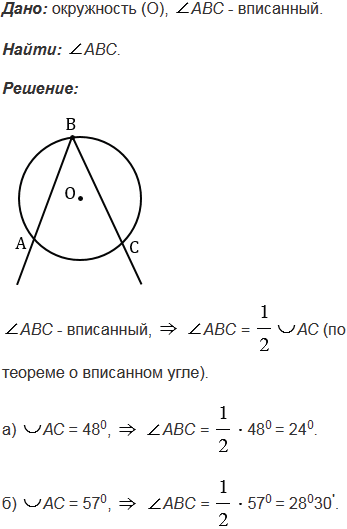 Найдите вписанный угол АВС, если дуга АС, на которую он опирается, равна: а) 480; б) 570; в) 900; г) 1240; д) 1800.