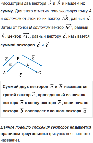 Объясните какой вектор называется суммой двух векторов. В чем заключается правило треугольника сложения двух векторов?
