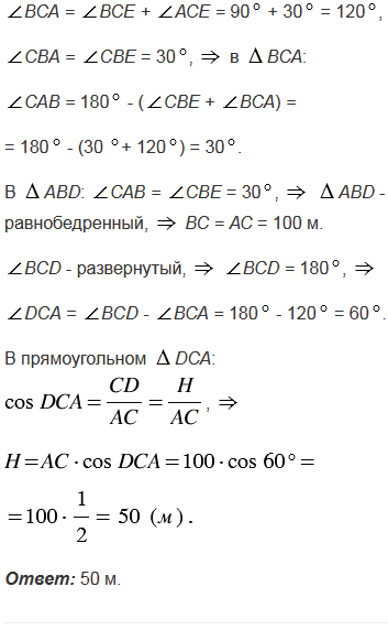 На горе находится башня, высота которой равна 100 м (рис. 299). Некоторый предмет А у подножия горы наблюдают сначала с вершины В башни под углом 600 к горизонту, а потом с ее основания С под углом 300. Найдите высоту Н горы.